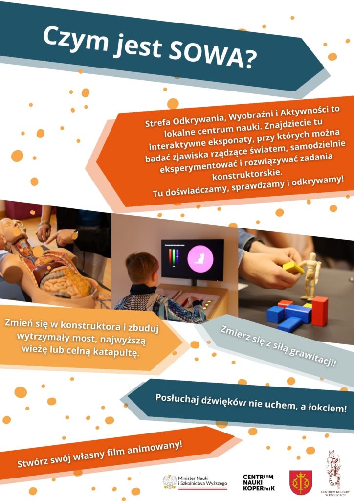 Strefa Odkrywania Wyobraźni i Aktywności „SOWA” w Ryglicach to przestrzeń do kreatywnego działania, wypełniona interaktywnymi eksponatami. Można tu zdobywać wiedzę w ciekawy i inspirujący sposób przez różnego rodzaju eksperymenty.